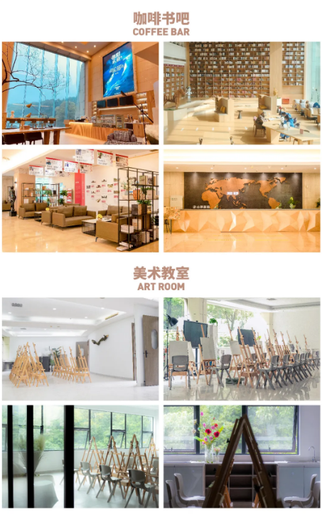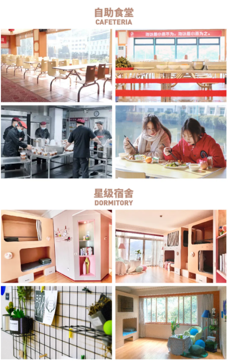 學校建立高標準自助食堂、五星級宿舍、美術館、多媒體教室、體育館、舞蹈室、閱覽室、